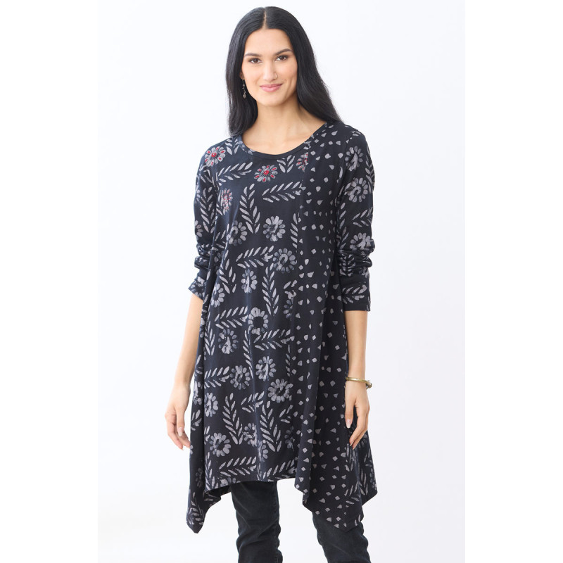 Soft jersey long tee in grey batik block prints with a contrast side panel. Ready to pair with pants or leggings, the knit tunic has a handkerchief hem and red and grey hand embroidery accents.