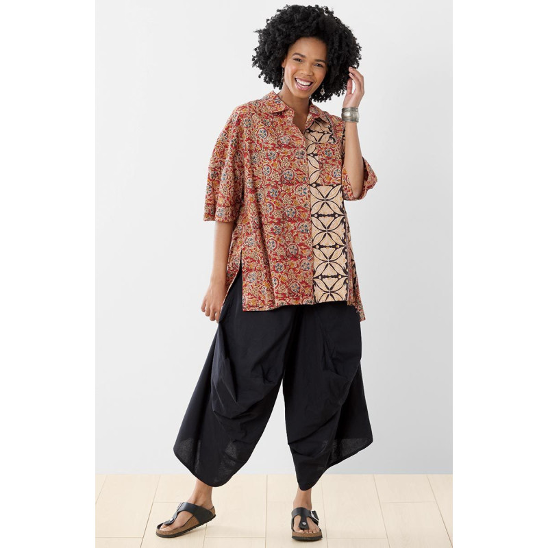 When you're ready for that eye-catching style, this draped leg pant is what you need. The unique wide-leg gathers make this organic cotton pant a new take for basic black. Elastic waist. Tonal hand embroidery on front pockets.