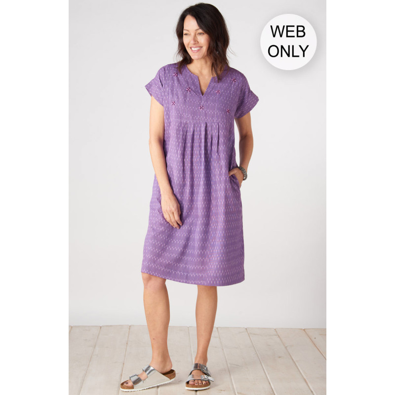 Easy notch-neck dress in summertime violet Ikat. Hand embroidered florals and seam detail accent the yoke which gives gentle gathers. Ready to go everywhere!