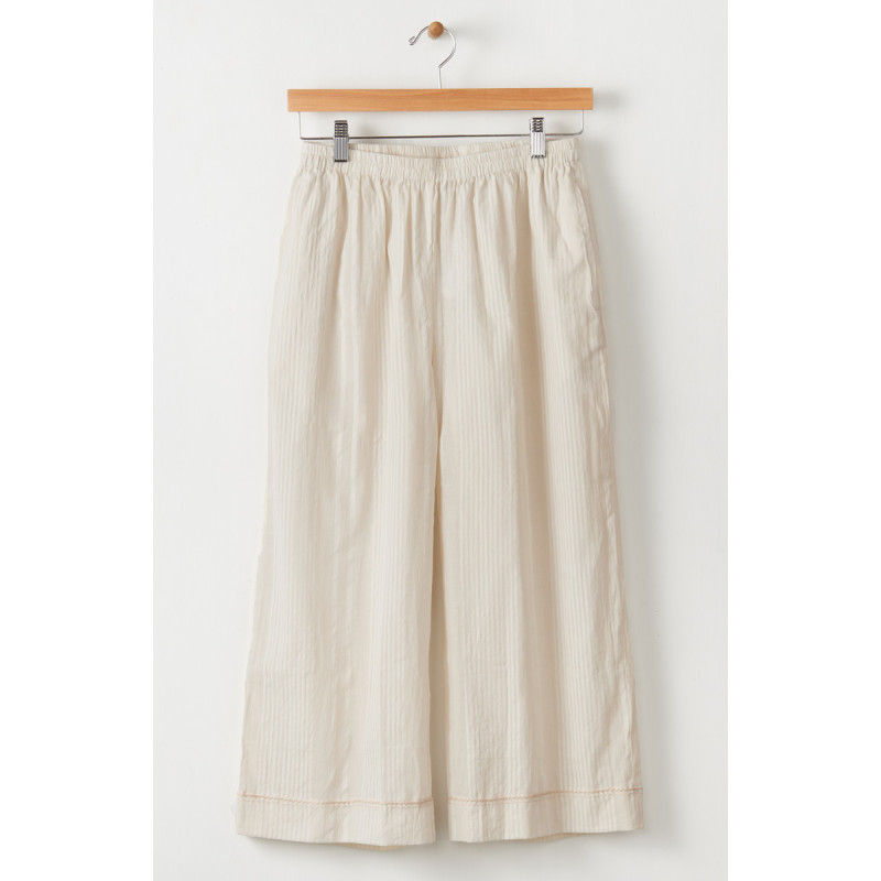 Our lightweight slightly-sheer cropped pant in a soft off-white textured stripe. Perfect to layer under MarketPlace dresses and long shirts. Tonal hand embroidery accents at hem.