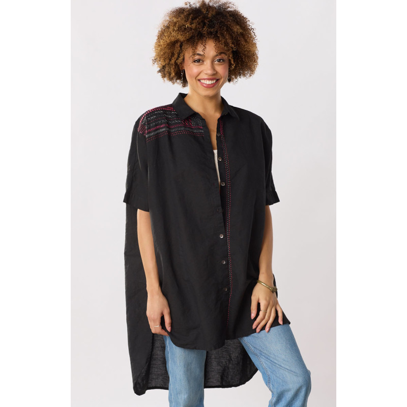 Shirt styling in basic black with colorful hand embroidery highlights, this linen/cotton blend big shirt is generously styled with dramatic dolman sleeves, a high-low shirttail hem and deep side slits for a great sweep.