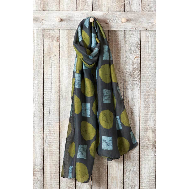 A soft cotton/silk batik block printed scarf in two shades of green on grey-green. Hand-stitched rolled edges with chindi accent tassels.